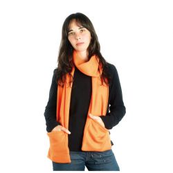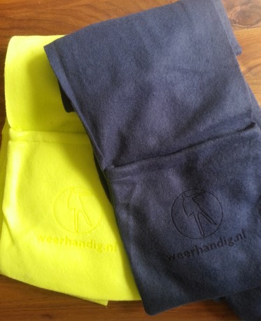 Een sjaal met zakken aan de uiteinden is de oplossing. Het is van fleece materiaal zodat hij zo dun mogelijk is. Hij is er in twee kleuren: geel (lime) en blauw en er staat subtiel het logo van weerhandig.nl op in dezelfde kleur.