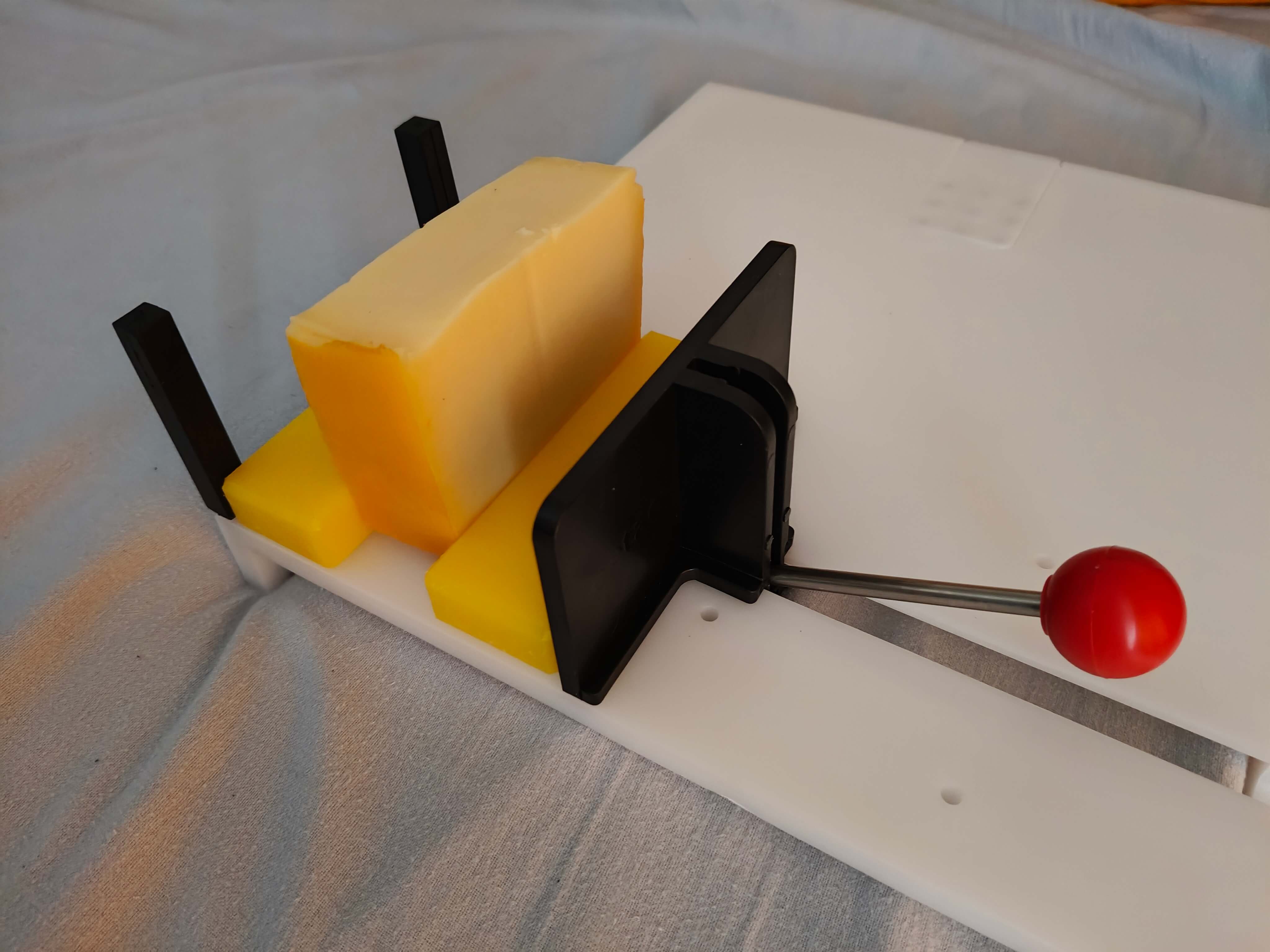 Daar heeft een lotgenoot een uitvinding voor gedaan, mij gemaild en ik heb hem op grote schaal geschikt gemaakt voor verkoop. Vele mensen hebben al een fixeerplank in huis die het hun mogelijk maakt dingen te bewerken met één hand. Als hulpmiddel heb ik toegevoegd twee blokjes die het mogelijk maken de kaas, hoe dik of dun ook te fixeren en daar kaas mee te schaven. Het is op alle standen te gebruiken afhankelijk van het formaat van het kaasstuk.