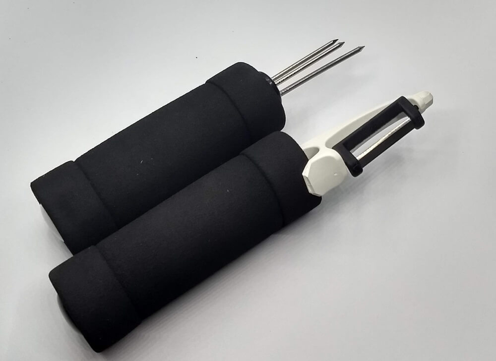 • Met de ene hand prik je de te schillen groente of fruit op het schilhandje.Ā Ze zijn bewust niet allemaal dezelfde lengte om het prikken soepeler te laten verlopen;